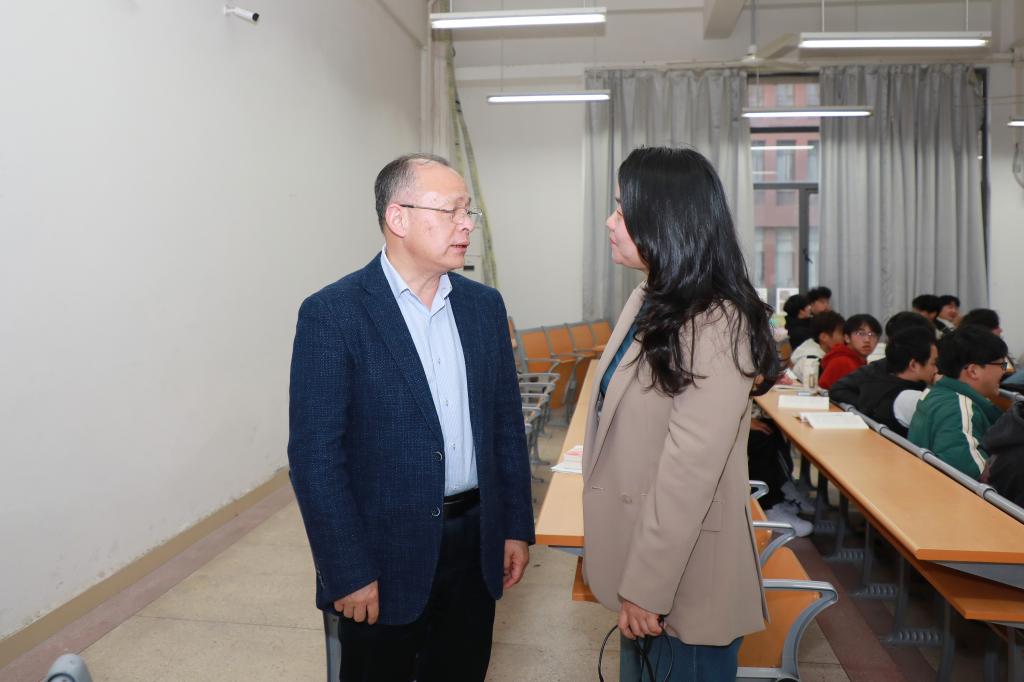 听课过程中,郭永存详细记录教学环节、授课内容和师生互动情况。课间,郭永存与陈偲偲老师开展交流互动,对其扎实的教学功底和娴熟的授课表现给予肯定。